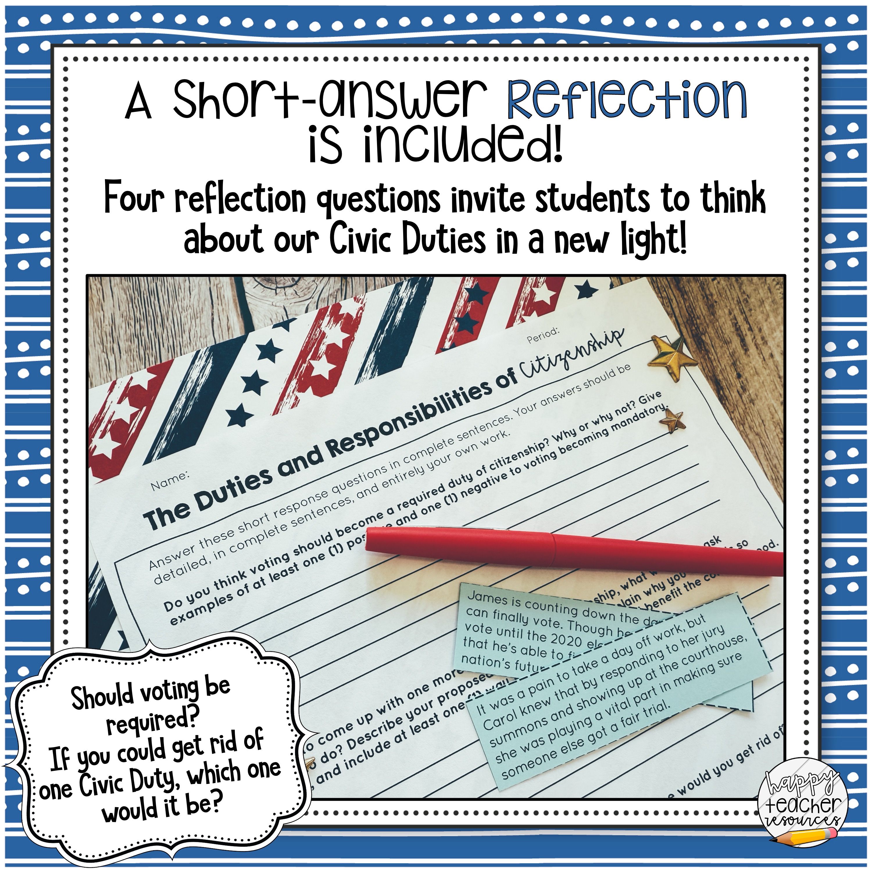 ✯ The Civic Duties & Responsibilities Short-Answer Reflection. Four questions challenge students to think a little more critically about citizenship and our Civic Obligations.
