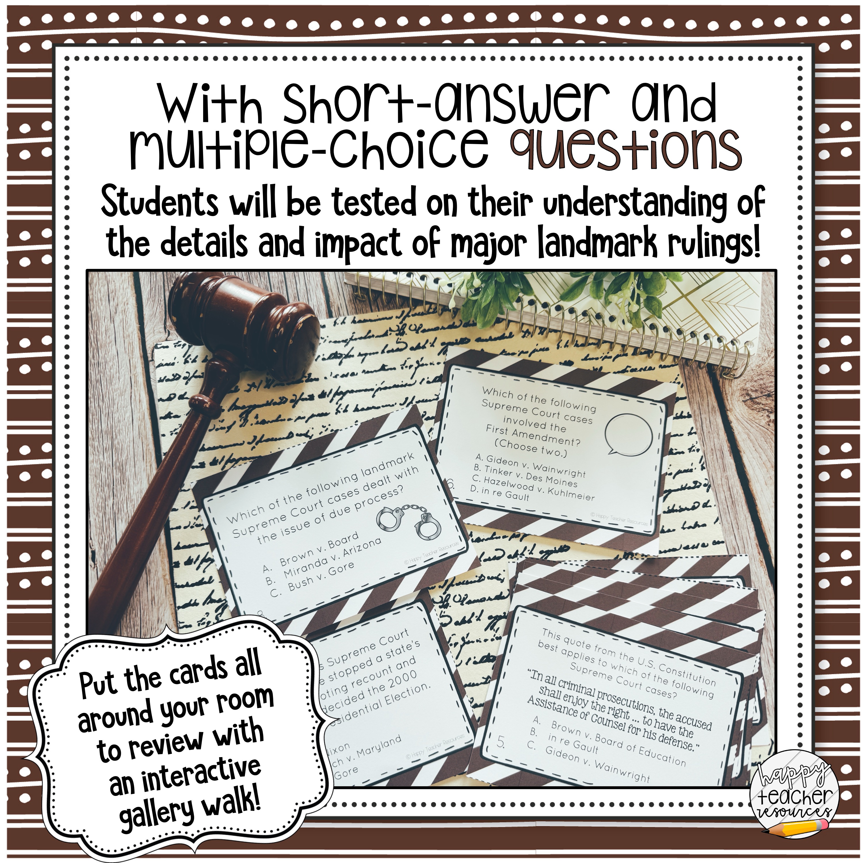 This Civics Task Cards: Landmark Supreme Court Cases Judicial Branch Review offers a fun, hands-on review of some of the most historic Landmark Supreme Court Cases! Which Bill of Rights Amendment connects to Tinker v. Des Moines? How did Brown v. Board of Education overturn Plessy v. Ferguson? This set of 32 task cards contains comprehension questions, vocabulary review, and quotation and picture analysis, perfect for middle or high school students reviewing Landmark Supreme Court Cases in Civics, American Government, or American History class! Use as test prep, review for the Civics EOC, individual practice, or class wide in an interactive gallery walk!