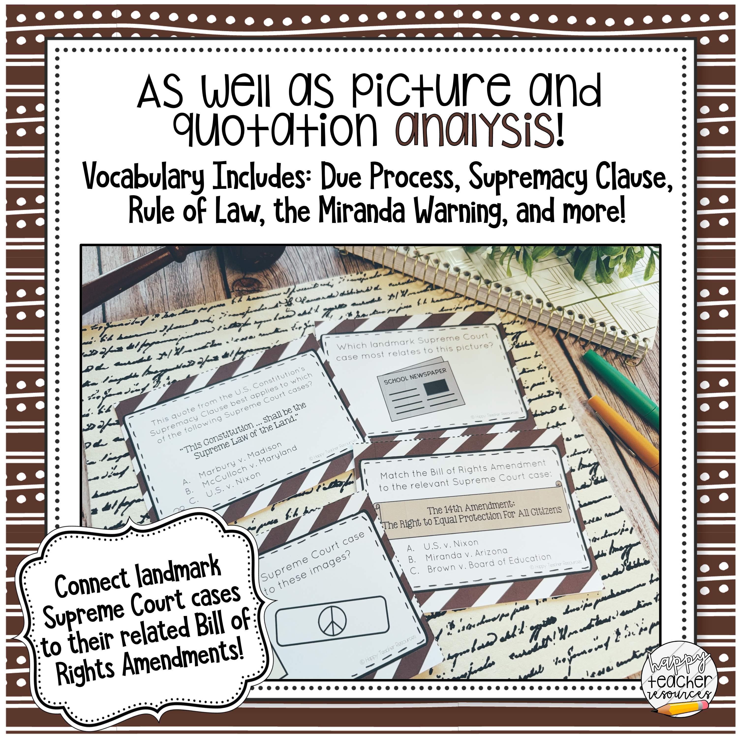 - Vocab includes: Due Process, the Supremacy Clause, Miranda Warning, Fourteenth Amendment, “Separate but Equal”, segregation, rule of law, and more!