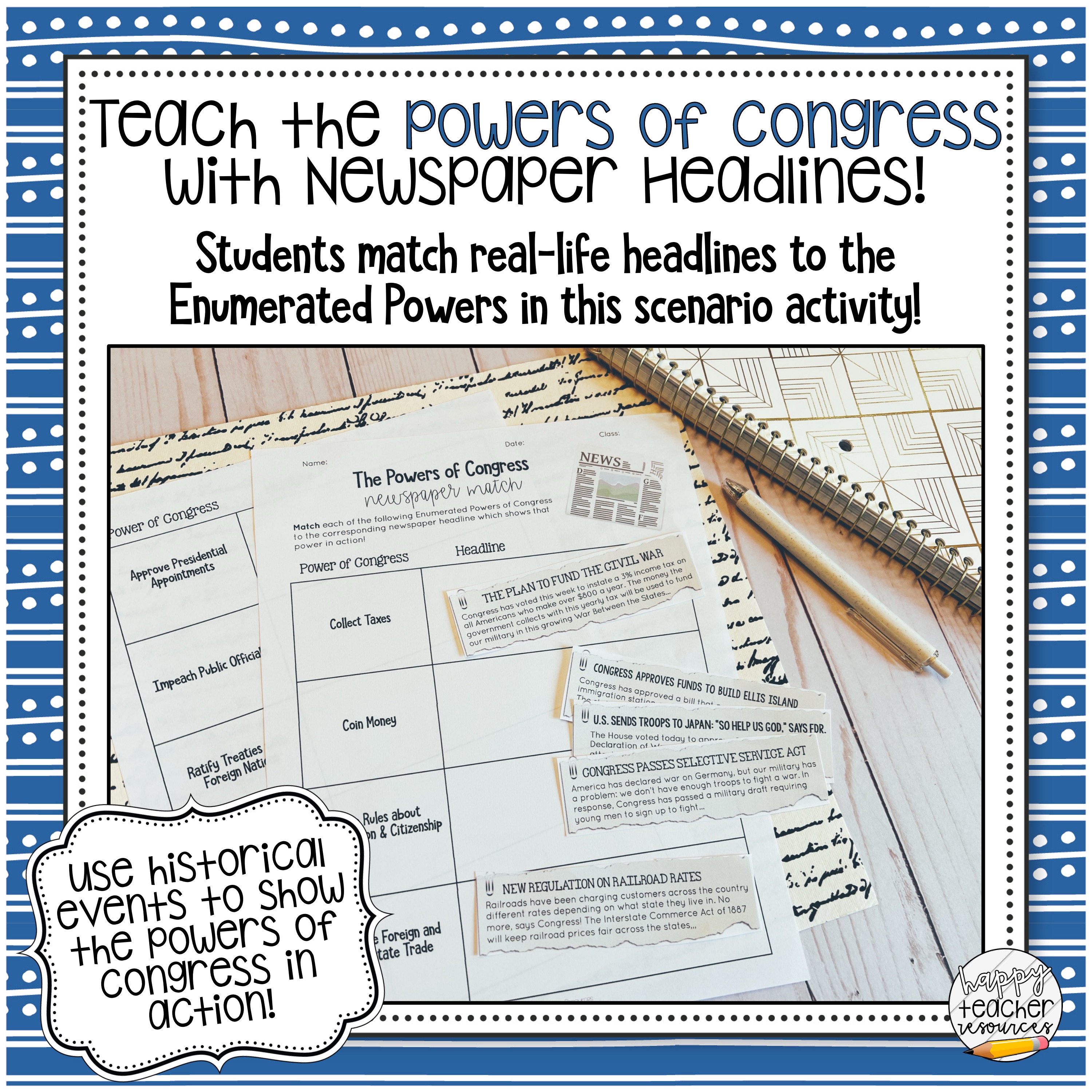 - This scenario matching activity has students match newspaper headlines of Congressional actions to the Enumerated Powers of Congress. In this hands-on activity, students make connections between real-life events and the responsibilities of the Legislative Branch.