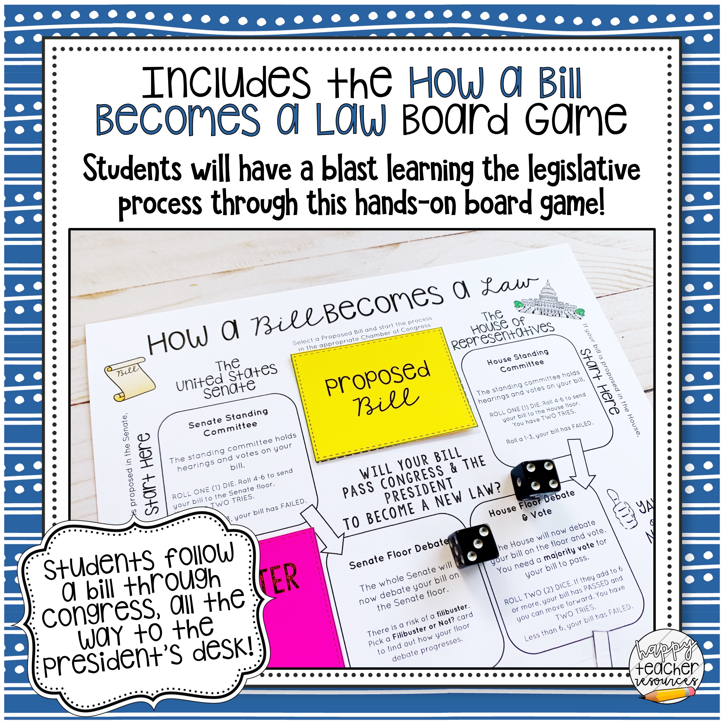 - This super fun board game takes students through the legislative process as they follow a bill through committee, floor debates, floor votes, conference committees, and the presidential veto process. How many bills can your students pass before time runs out? A reflection worksheet is included.