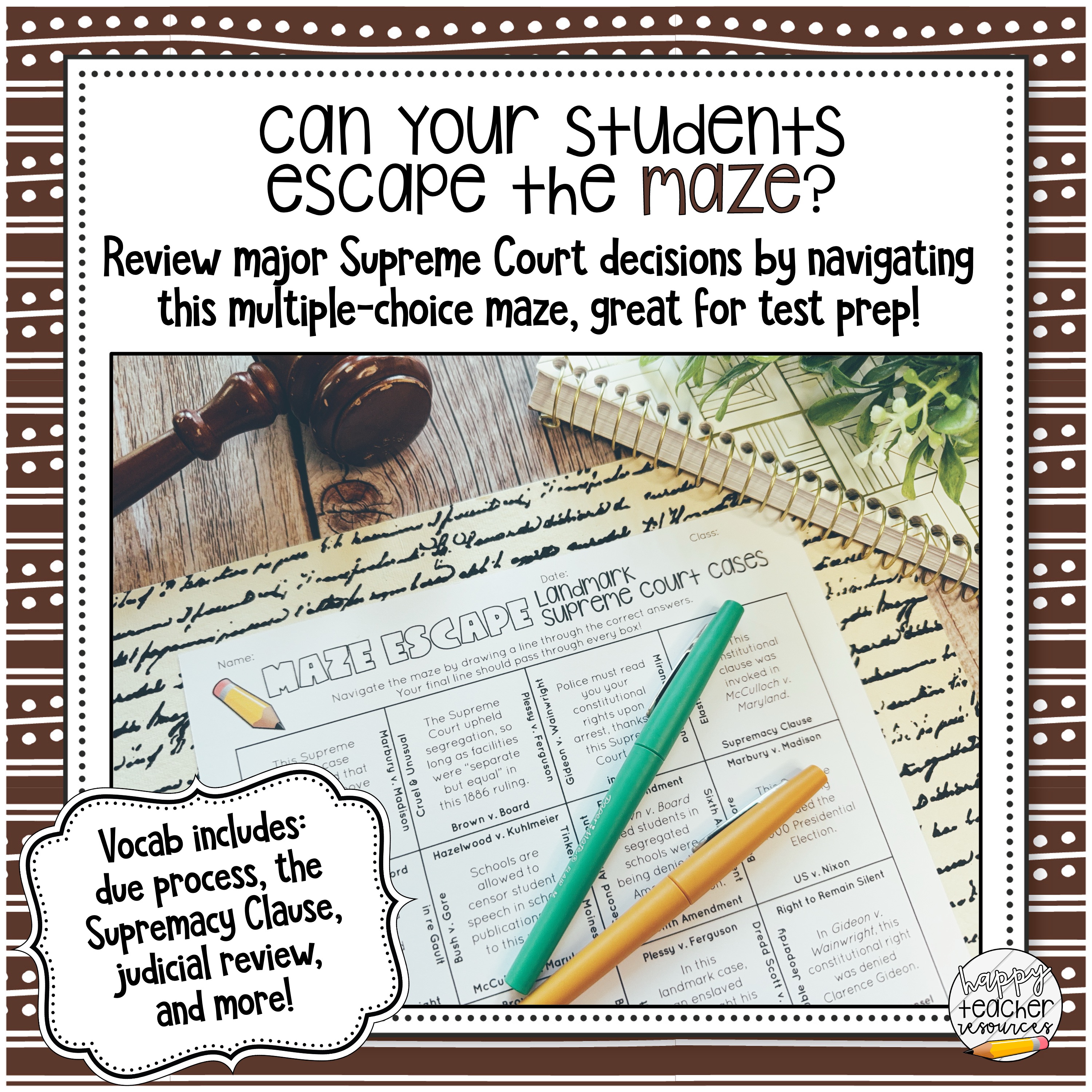 ✯ A Multiple-Choice Maze Escape. Students navigate the maze of review questions by drawing a straight line through each correct answer. By the time they reach the finish, their line should pass through every box! Questions include vocabulary and key concepts related to landmark Supreme Court Cases.