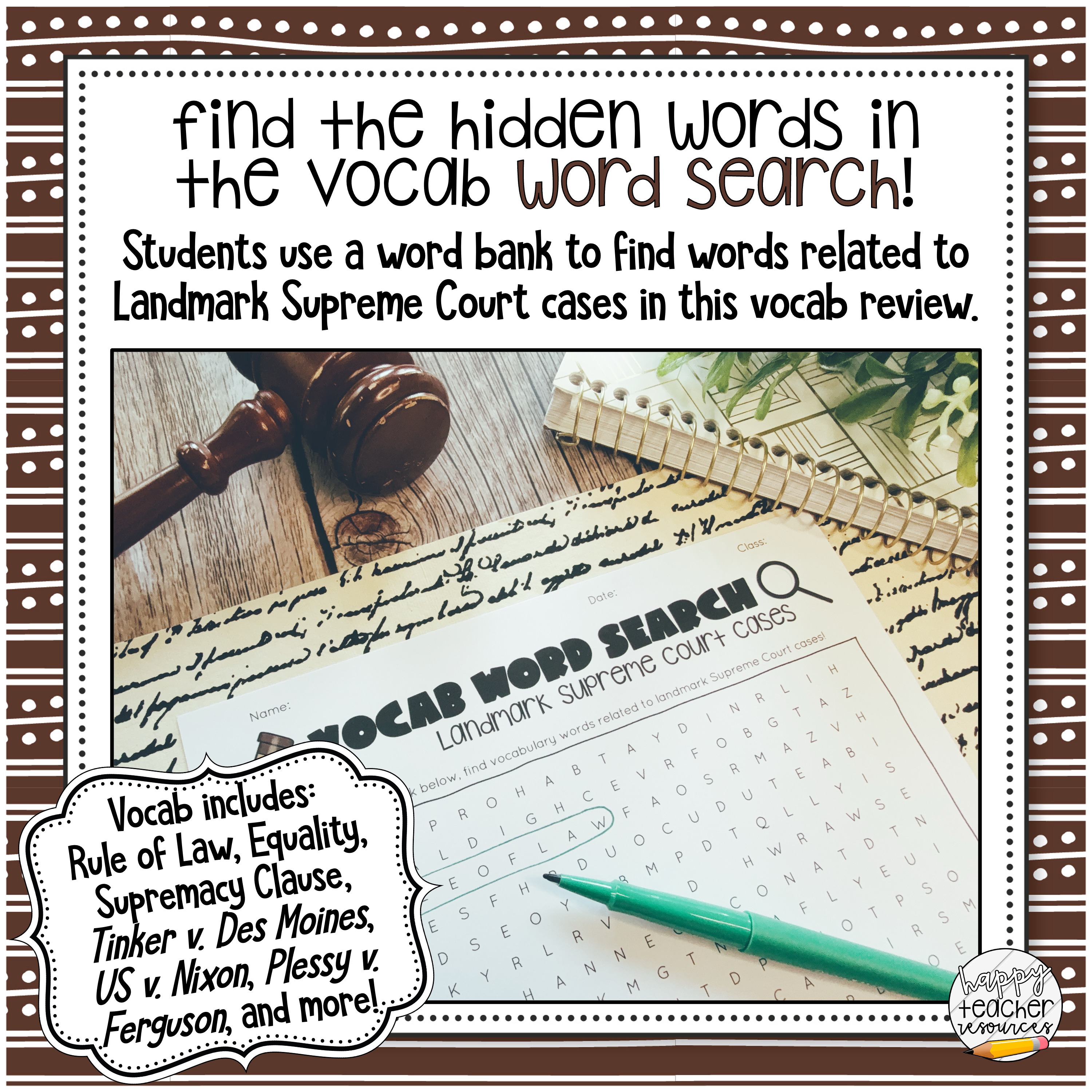 • Vocabulary includes: Fourteenth Amendment, First Amendment, Segregation, Supremacy Clause, Tinker v. Des Moines, Brown v. Board, Plessy v. Ferguson, and more!