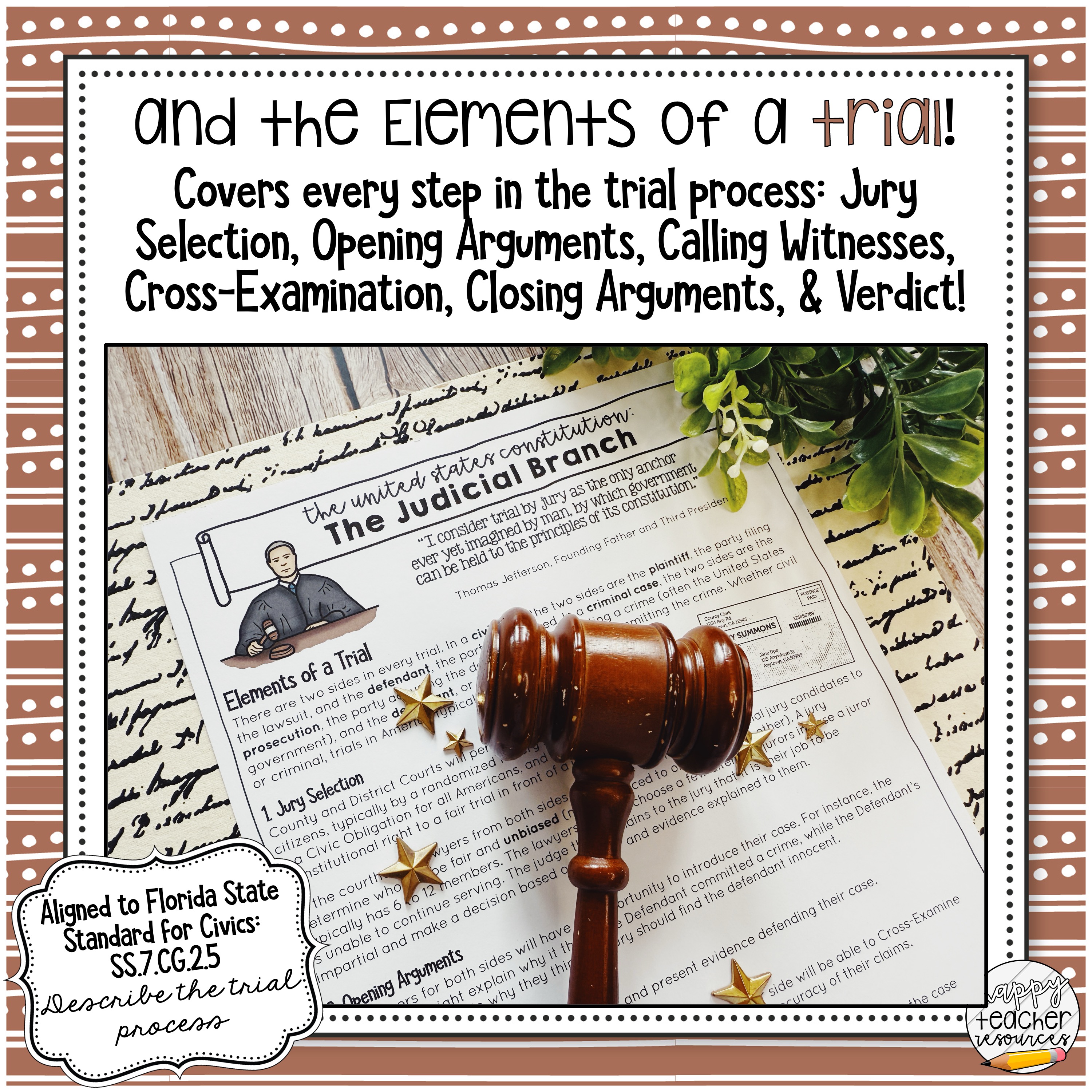 • SS.7.CG.2.5 Describe the trial process and the role of juries in the administration of justice at the state and federal levels.
